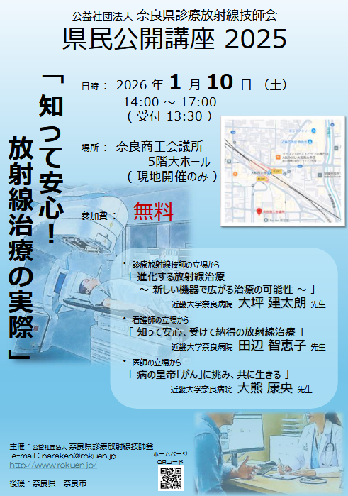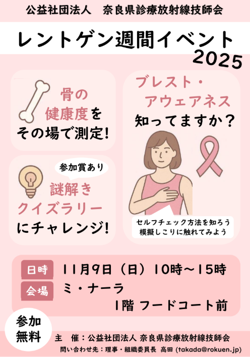 -------------------------------------------------------------------------- ◇ イベントのご案内 ◆公益社団法人 奈良県診療放射線技師会 県民公開講座 2025 日時:2026年1月10日(土)14:00〜17:00(受付 13:30〜) 場所:奈良商工会議所 5階大ホール(現地開催のみ) 参加費:無料 ![]() ![]() ◆公益社団法人 奈良県放射線技師会 レントゲン週間2025 日時 :2025年11月9日(日)10時〜15時 場所 :ミ・ナーラ 1階 フードコート前 費用 :無料 ![]() ◆公益社団法人 奈良県放射線技師会 放射線フェスタ2025 日時 :2025年8月17日(日)10時〜15時 場所 :近鉄百貨店 橿原店 1F メビウスホール 費用 :無料 ![]() ◆公益社団法人 奈良県放射線技師会 県民公開講座2024『変形性関節症』 日時 :2025年1月11日(土)14:00〜17:00 開催場所:橿原市商工経済会館 7階大ホール 開催形式:現地開催 費用 :無料 ![]() ![]() ![]() ◆「放射線フェスタU 2024」 開催のお知らせ ![]() ◆「放射線フェスタ2024」 開催のお知らせ ◆2023年度 奈良県診療放射線技師会 県民公開講座 のご案内 テーマを「認知症」と題し、 ![]() ◆2022年度 近畿地域診療放射線技師会学術大会 県民公開講座のご案内(滋賀県開催) 「がん患者さまと家族のための 自分らしい生き方と逝き方」 講 師 : 玉置 妙憂 先生 日 時 : 2023年2月12日(日)15:10〜16:10 場 所 : ピアザ淡海 (滋賀県) 費 用 : 無料 https://kinkigakujutsu-shiga. ◆2022年度 奈良県診療放射線技師会 県民公開講座 のご案内
