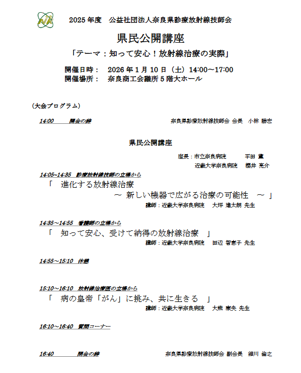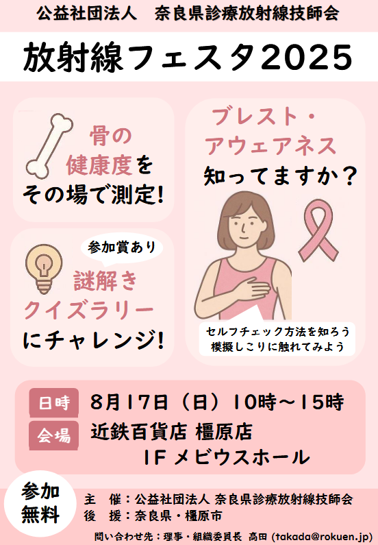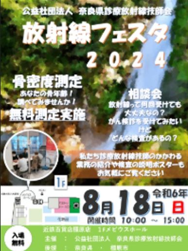 -------------------------------------------------------------------------- ◇ イベントのご案内 ◆公益社団法人 奈良県診療放射線技師会 県民公開講座 2025 日時:2026年1月10日(土)14:00〜17:00(受付 13:30〜) 場所:奈良商工会議所 5階大ホール(現地開催のみ) 参加費:無料 ![]() ![]() ◆公益社団法人 奈良県放射線技師会 レントゲン週間2025 日時 :2025年11月9日(日)10時〜15時 場所 :ミ・ナーラ 1階 フードコート前 費用 :無料 ![]() ◆公益社団法人 奈良県放射線技師会 放射線フェスタ2025 日時 :2025年8月17日(日)10時〜15時 場所 :近鉄百貨店 橿原店 1F メビウスホール 費用 :無料 ![]() ◆公益社団法人 奈良県放射線技師会 県民公開講座2024『変形性関節症』 日時 :2025年1月11日(土)14:00〜17:00 開催場所:橿原市商工経済会館 7階大ホール 開催形式:現地開催 費用 :無料 ![]() ![]() ![]() ◆「放射線フェスタU 2024」 開催のお知らせ ![]() ◆「放射線フェスタ2024」 開催のお知らせ ◆2023年度 奈良県診療放射線技師会 県民公開講座 のご案内 テーマを「認知症」と題し、 ![]() ◆2022年度 近畿地域診療放射線技師会学術大会 県民公開講座のご案内(滋賀県開催) 「がん患者さまと家族のための 自分らしい生き方と逝き方」 講 師 : 玉置 妙憂 先生 日 時 : 2023年2月12日(日)15:10〜16:10 場 所 : ピアザ淡海 (滋賀県) 費 用 : 無料 https://kinkigakujutsu-shiga. ◆2022年度 奈良県診療放射線技師会 県民公開講座 のご案内