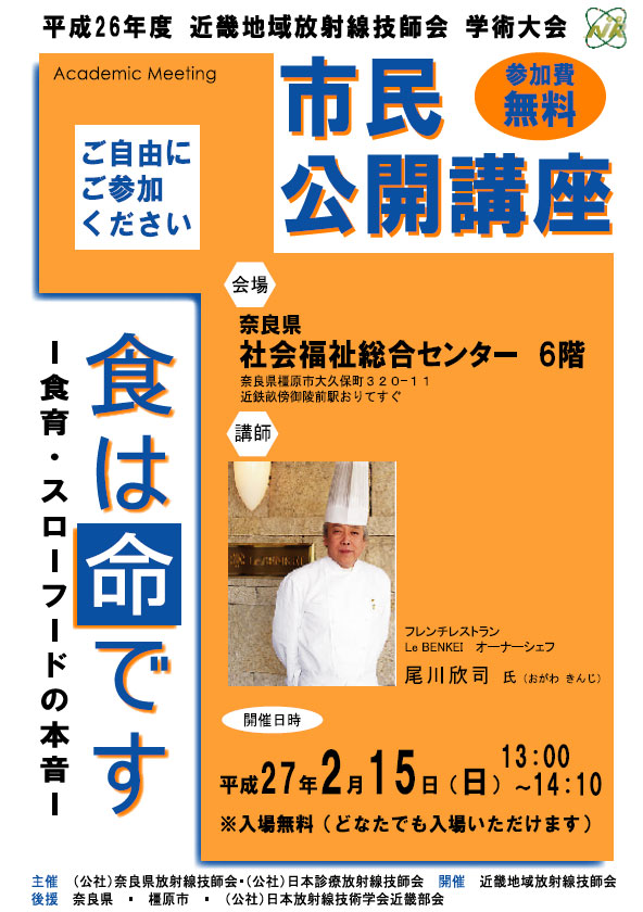 日時:平成27年2月15日(日) 会場:奈良県社会福祉総合センター ![]() 主 催:公益社団法人 日本診療放射線技師会 公益社団法人 奈良県放射線技師会 実 施:近畿地域放射線技師会 事前登録:平成26年9月15日(月)〜平成27年2月7日(土)※終了いたしました 参加費用:会員1,000円 非会員2,000円 学生無料 その他 :※学生の方は学生証を持参して下さい。学生とは診療放射線技師養成機関の学生を対象とし、診療放射線技師免許未取得者に限ります。(大学院生など、技師免許取得者は対象になりません) 参加登録:事前参加登録は終了いたしました(2月7日まで) 演題募集:一般演題募集は終了いたしました お知らせ 2015/2/15 近畿地域放射線技師会 学術大会 は終了いたしました。 2015/2/3 学術大会プログラム 更新しました 2015/1/26 事前登録の締め切りを2月7日まで延長しました 2015/1/7 公開講座ポスターが完成しました 2014/12/3 一般演題の募集締切を12/20まで延長いたします 2014/11/26 学術大会プログラム アップしました 2014/11/18 ランチョンセミナーに関する注意事項を追加しました 2014/9/29 一般演題の申し込み締切日は11月30日です 2014/9/15 事前参加登録を開始しました 2014/9/11 近畿地域放射線技師会学術大会ページを開設しました ---------------------------------------------------------------------------------------------- |