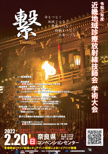 ◆◇令和3年度近畿地域診療放射線技師会学術大会終了のご報告とお礼◇◆ 謹啓 春暖の候、皆様におかれましては益々ご清祥のこととお慶び申し上げます。 平素より、格段のご高配を賜り厚く御礼申し上げます。 さて、この度の令和3年度近畿地域診療放射線技師会学術大会におきましては、格別のご指導とご支援を賜りまして誠に有難うございました。 お陰様で、令和4年2月20日(日)に開催いたしましたライブ配信、および令和4年2月25日(金)からのオンデマンド配信によるWeb学術大会は、令和4年3月28日(月)をもちまして無事終了することが出来ました。 今回の学術大会は、コロナ禍による1年延期、ハイブリッドへの変更、そして最終的には完全Web開催へと度重なる変更で関係各位には大変ご迷惑をおかけしました。 また、学術大会の運営にあたりましては、初めてのWeb開催となりましたので、何かと不慣れな点が多く不行届きの点も多々あったかと存じますが、何卒ご容赦下さいますようお願い申し上げます。 最後に、学会にご参加いただきました会員の皆様、協賛セミナーあるいはバナー広告や広告掲載などを通じ、本学術大会をご支援くださいました企業・団体の皆様、そして学会企画、準備、運営に携わっていただきました実行委員の皆様の今後益々のご活躍とご多幸を祈念して、お礼の挨拶とさせていただきます。 謹白 令和4年3月28日 令和3年度近畿地域診療放射線技師会学術大会 大会長 髙谷英明 実行委員長 小林勝宏 ◆◇令和3年度近畿地域診療放射線技師会学術大会 学術奨励賞◇◆ 演題名:「多職種間協議における電子デバイス装着患者対応方法の新たな取り組み」 発表者:京都大学医学部附属病院 中川政幸 中川政幸様、受賞おめでとうございます。 ◆◇オンデマンド 質疑応答◇◆ オンデマンド配信の質問に対し、講師の先生よりご回答をいただきました。 回答者:画像手術支援分科会 牛尾哲敏 →→質疑応答の内容はこちら ![]() 主 催:公益社団法人 日本診療放射線技師会 公益社団法人 奈良県放射線技師会 実 施:近畿地域診療放射線技師会 後 援:奈良県・奈良市 ※オンデマンド配信期間 2月25日(金)正午~3月28日(月)正午まで ![]() 4月3日 オンデマンド質疑応答 掲載しました 3月28日 学術奨励賞 掲載しました 3月28日 オンデマンド配信 終了しました 2月25日 オンデマンド配信 開始ました 2月19日 抄録集アップしました 2月18日 視聴方法のご案内 追加しました 2月3日 参加登録期間 延長しました 2月2日 大会プログラム 更新しました 1月24日 原子力災害研修会 掲載しました 1月20日 開催形式が変更になりました 1月11日 演題募集 終了しました 12月25日 事前参加登録 開始しました 12月1日 演題募集期間 延長しました 1月10日まで 10月7日 国際セッション 演題募集 開始しました 10月4日 プログラム 掲載しました 10月1日 演題募集 開始しました 9月28日 近畿地域診療放射線技師会学術大会ページを開設しました ---------------------------------------------------------------------------- |