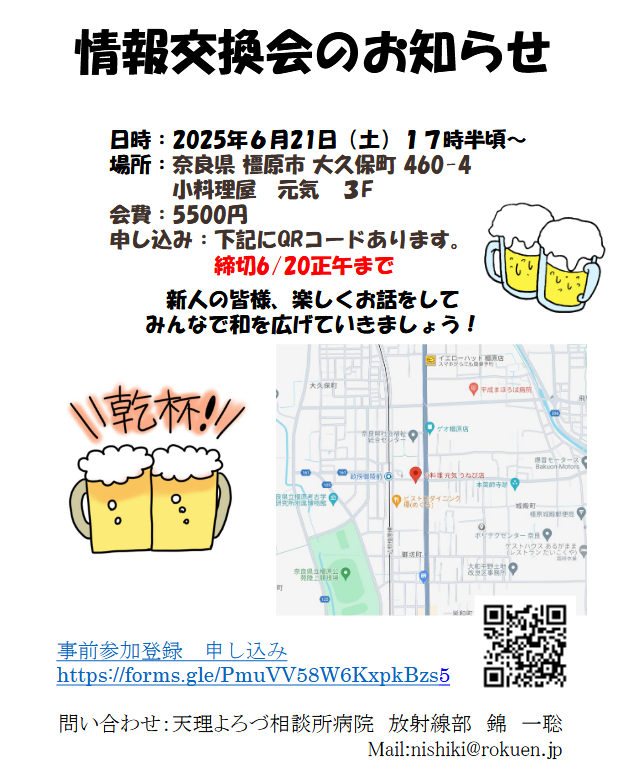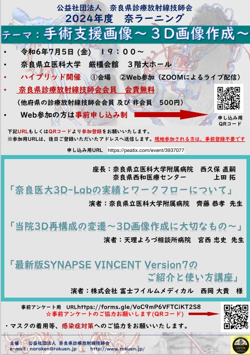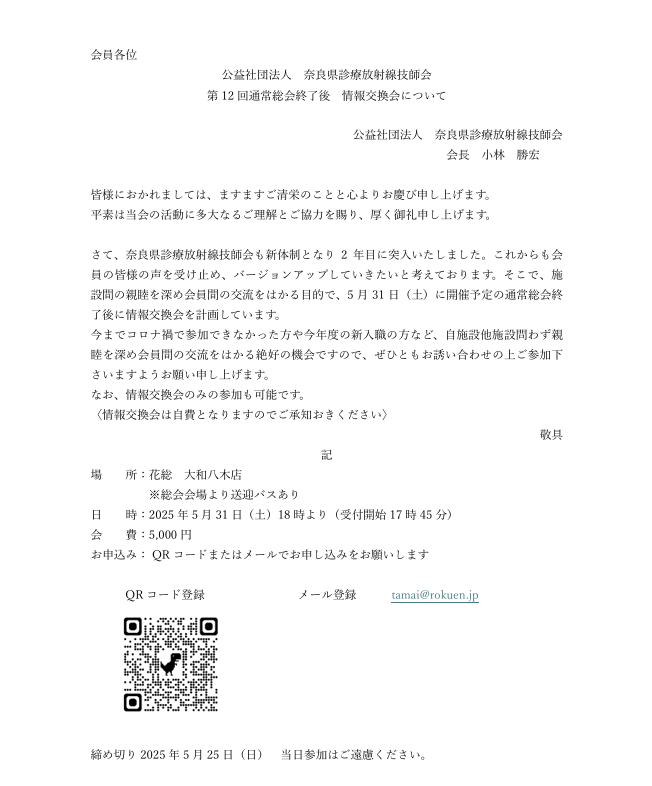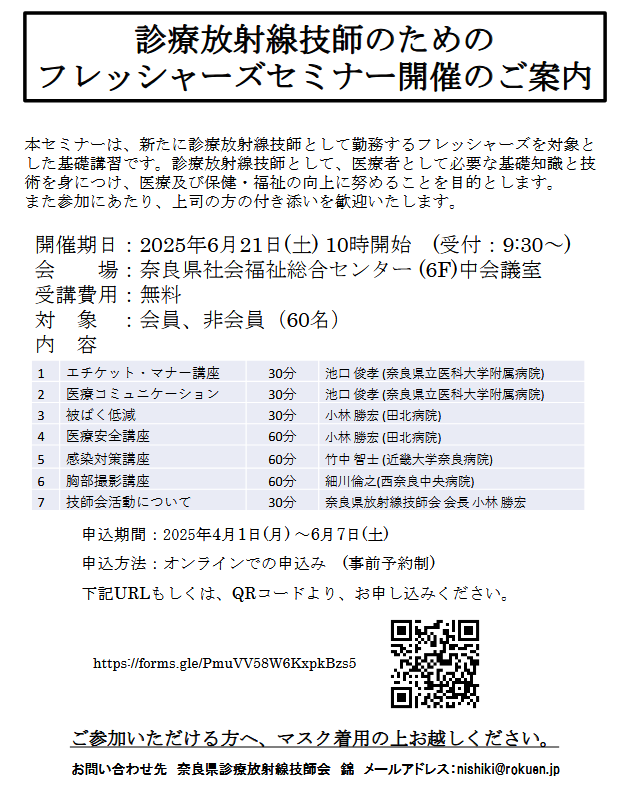 会員各位におかれましては、注意事項などをご参考のうえ、奈放技イベント会場下記の登録アドレスからご登録いただけますようお願いいたします。 なお、お預かりした情報は奈良県放射線技師会にて厳重に管理いたします。