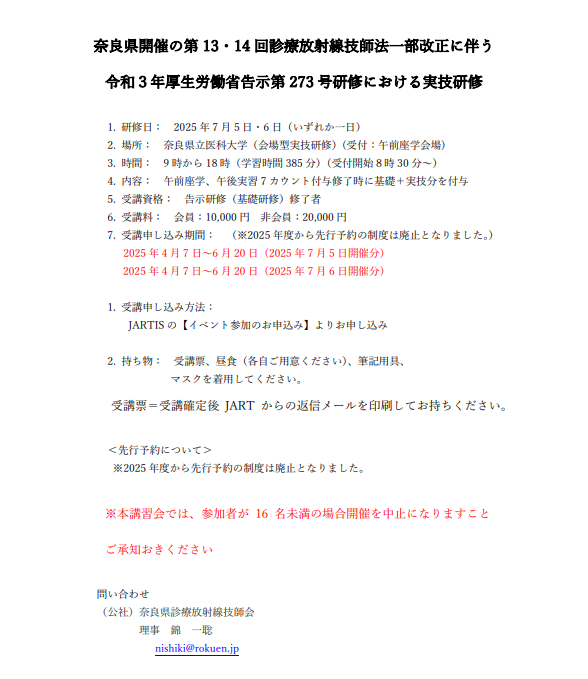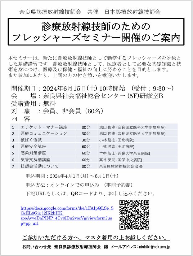 奈良県診療放射線技師会としても今後、政府および奈良県の意向により、講習会・研修会などイベントが中止・延期となる可能性がございます。