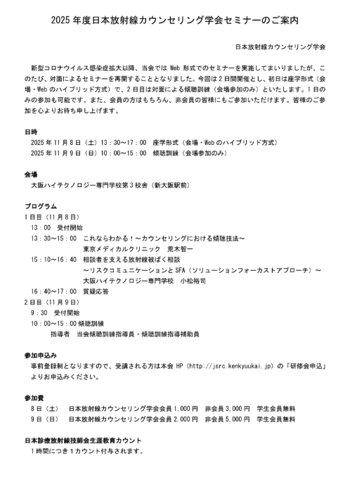 ◆2025年度 日本放射線カウンセリング学会セミナーのご案内